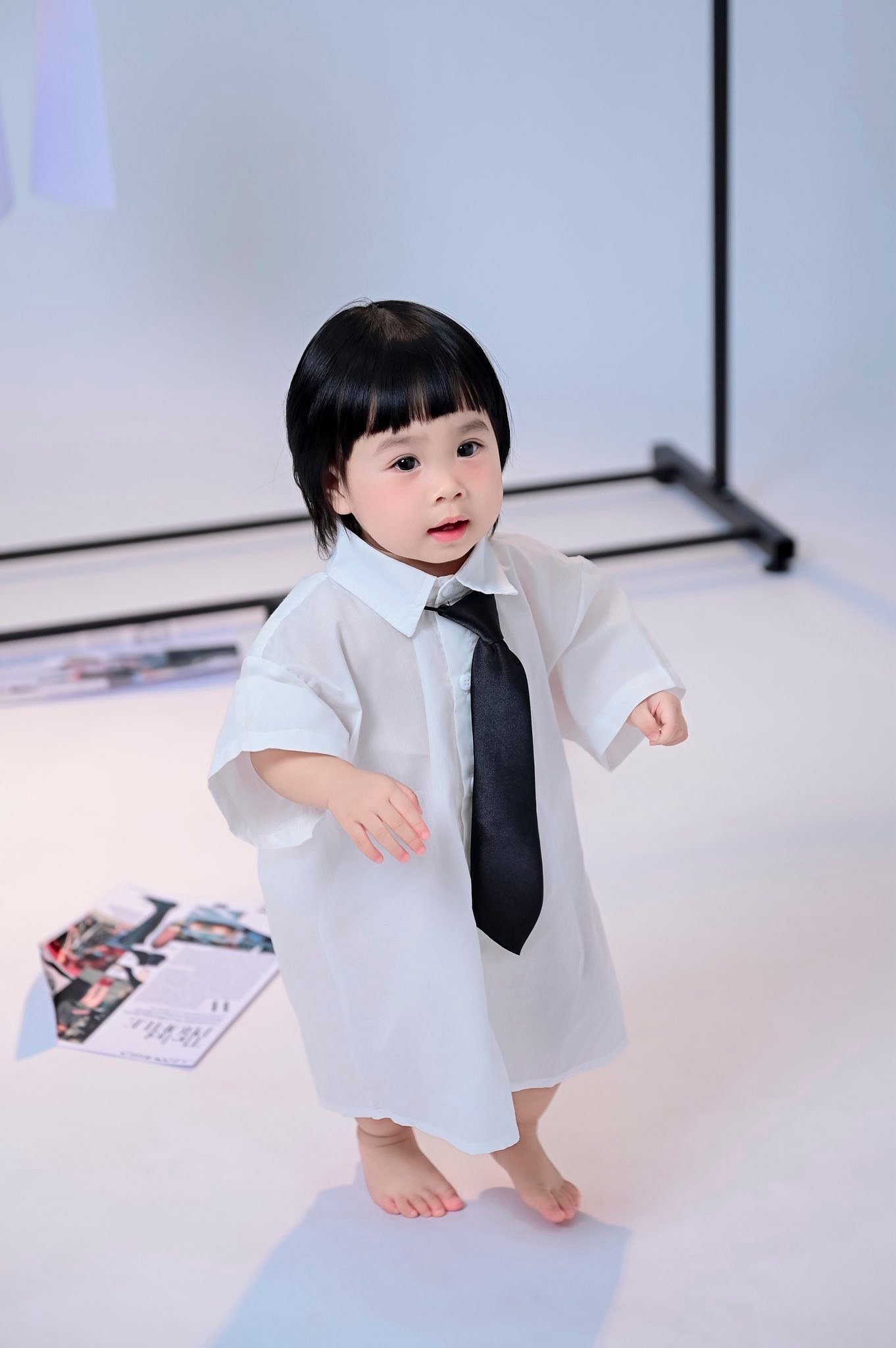 Chỉ cần sơ mi trắng và cà vạt đen, em bé đã ‘lên đồ’ chuẩn concept thời trang high-fashion. Ai bảo chỉ người lớn mới có thể lên bìa tạp chí Vogue?